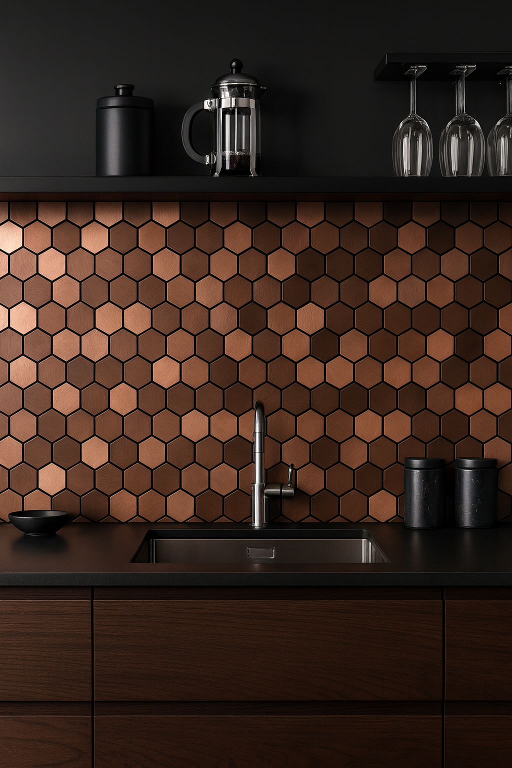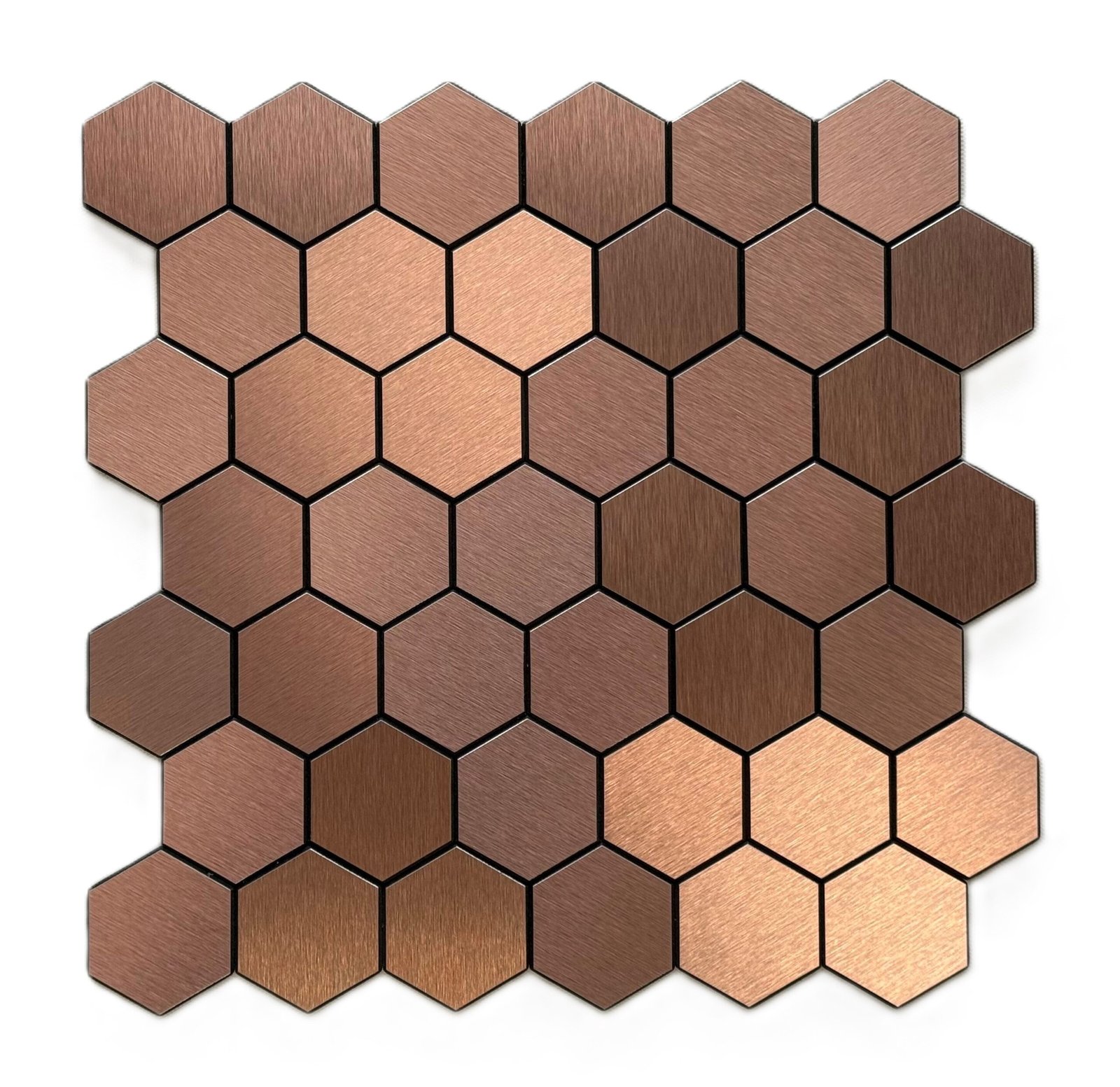 Luxury copper hexagon mosaic with brushed metal finish. Perfect for feature walls, kitchens, bathrooms, and high-end interior accents. Supplied on mesh backing for easy installation.