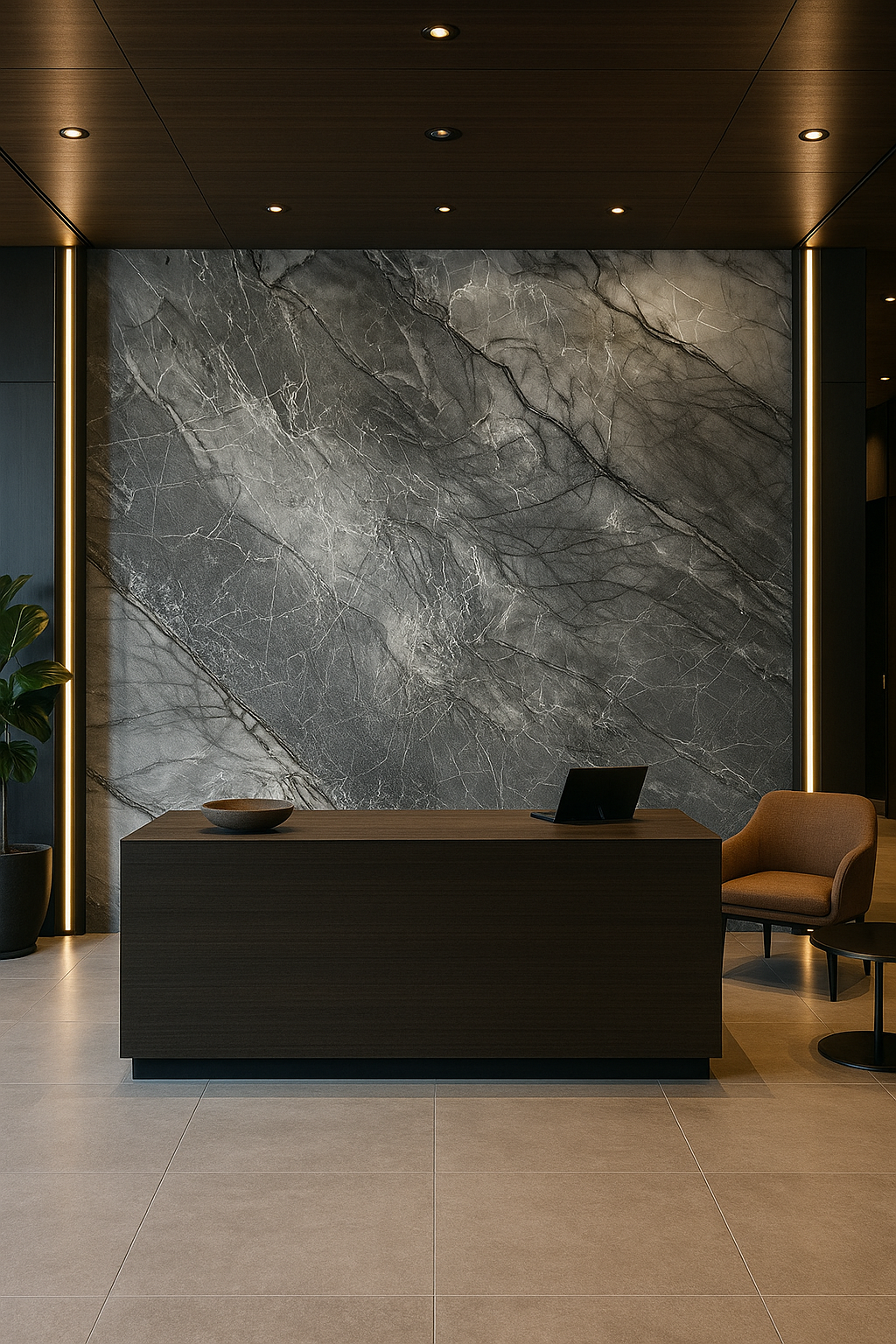 Royal grey marble PVC wall panel showing deep grey stone tones with natural white veining, used as a luxury interior wall covering