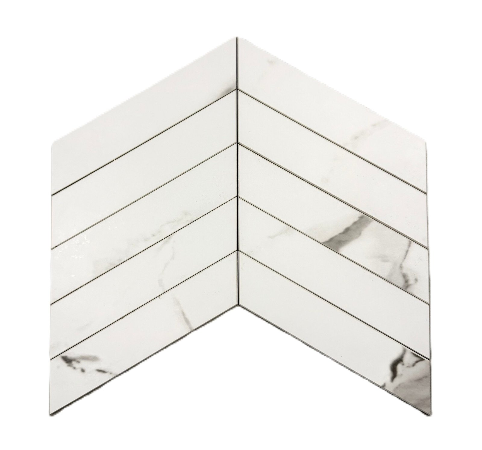 Luxury white marble chevron mosaic with subtle natural veining. Ideal for bathrooms, kitchens, splashbacks, and feature walls. Supplied on mesh backing for easy installation.