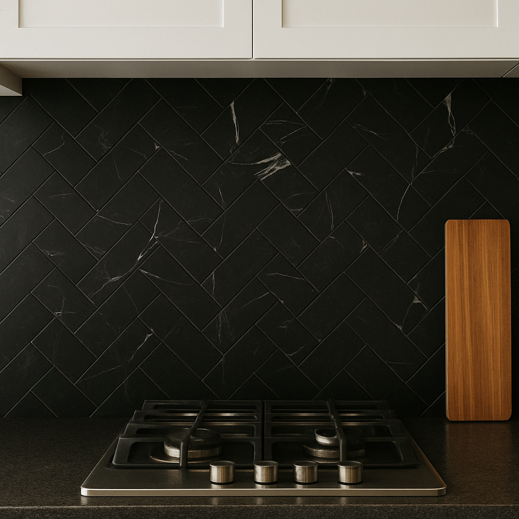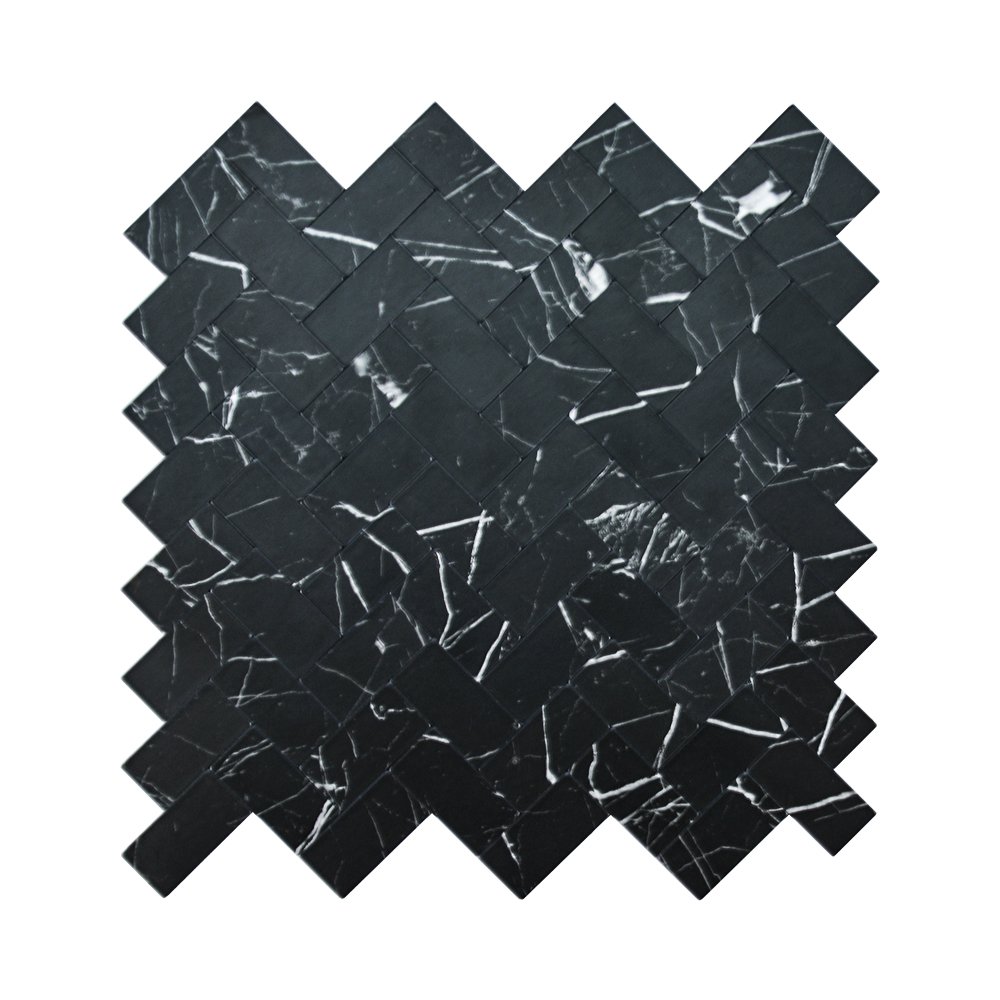 Luxury black marble weave mosaic with natural white veining. Ideal for bathrooms, kitchens, splashbacks, and feature walls. Supplied on mesh backing for easy installation.